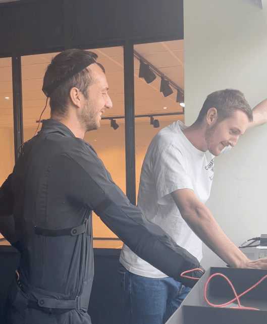 Dans cette séquence, Nicolas enfile la combinaison de 𝗺𝗼𝘁𝗶𝗼𝗻 𝗰𝗮𝗽𝘁𝘂𝗿𝗲 pendant que Timothée s’assure que chaque mouvement est parfaitement retranscrit.