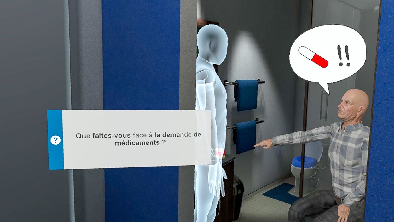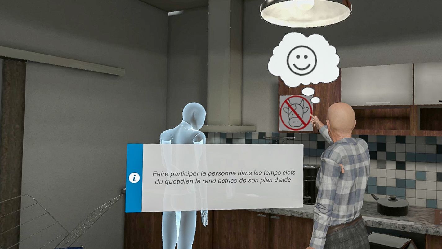 Cette formation vise à sensibiliser et prévenir les équipes d'aide à la personne face à certaines situations à risques. Les apprenants sont immergés dans l'appartement virtuel de personnes âgées et des situations de vie courantes sont présentées, pouvant être gérées avec une bientraitance active ou pouvant dévier vers une maltraitance ordinaire.