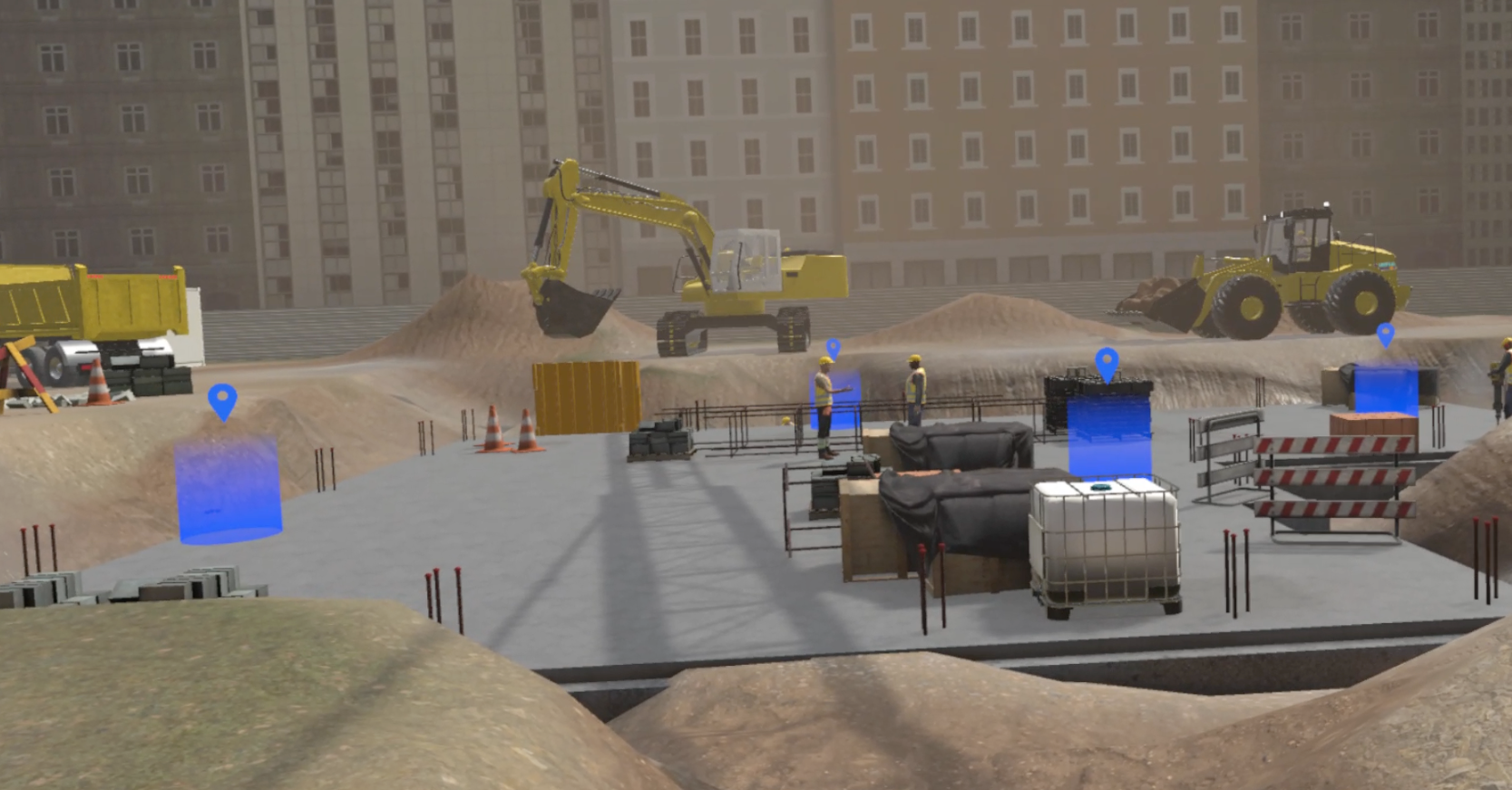 Modélisation 3D des environnements de chantier, programmation des interactions immersives et intégration des outils spécifiques aux Travaux Publics (balises, engins, équipements).