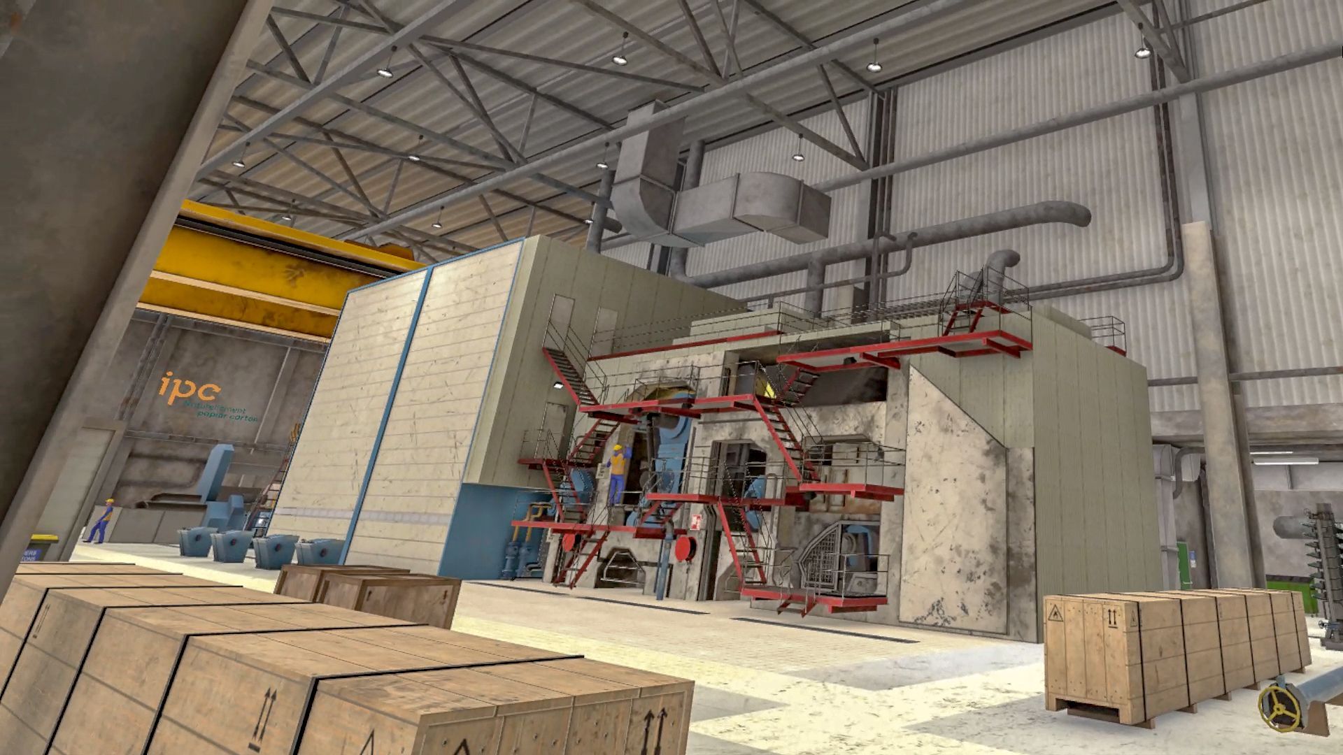 Modélisation 3D d'environnements réels pour recréer des usines au plus proche du réel, avec une immersion visuelle détaillée spécifique au secteur papier-carton.